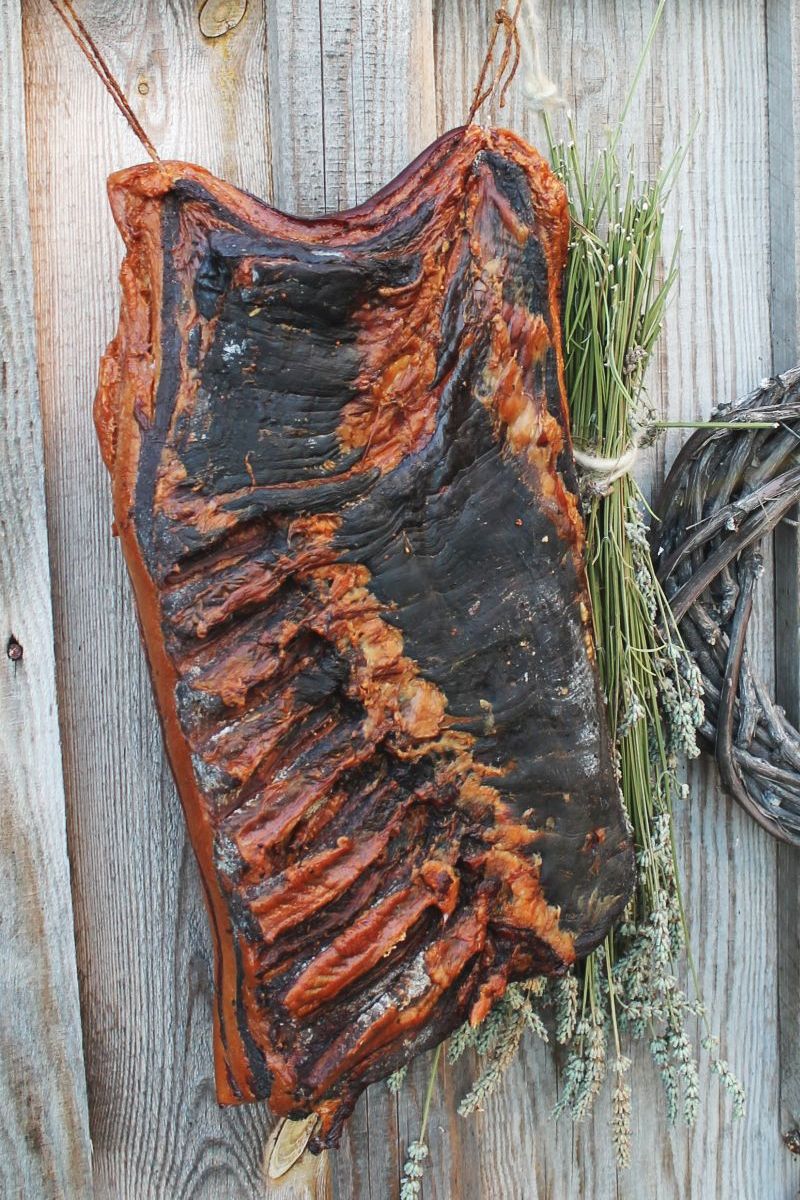Schweinespeck, Steinsalz, Zucker, Gewürze, Buchenrauch